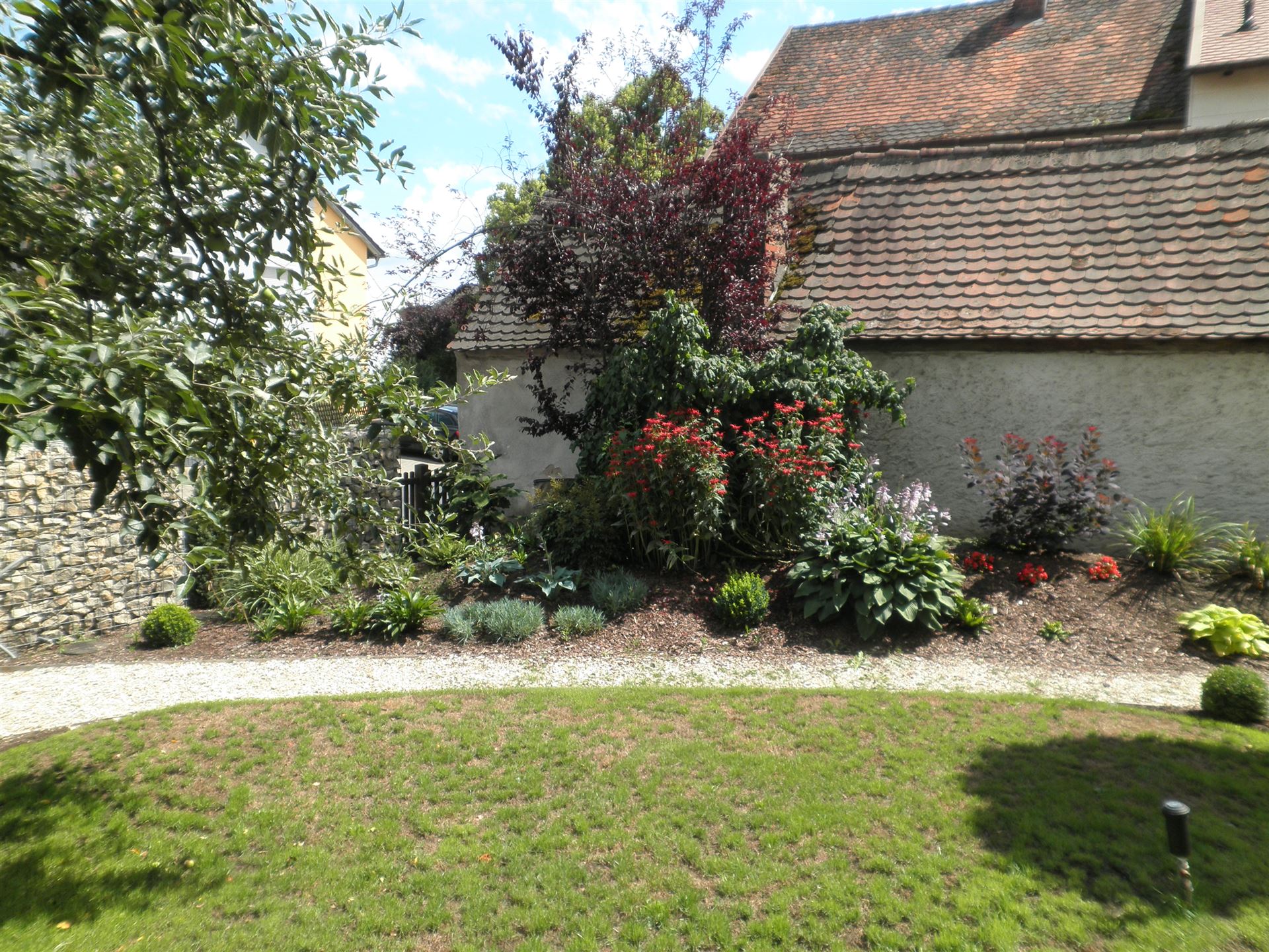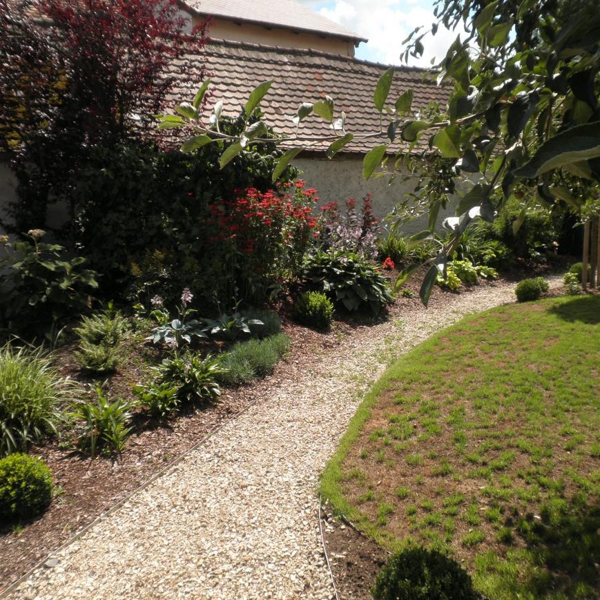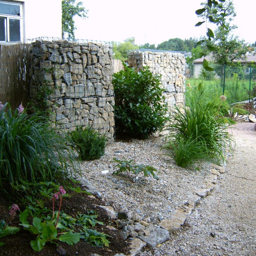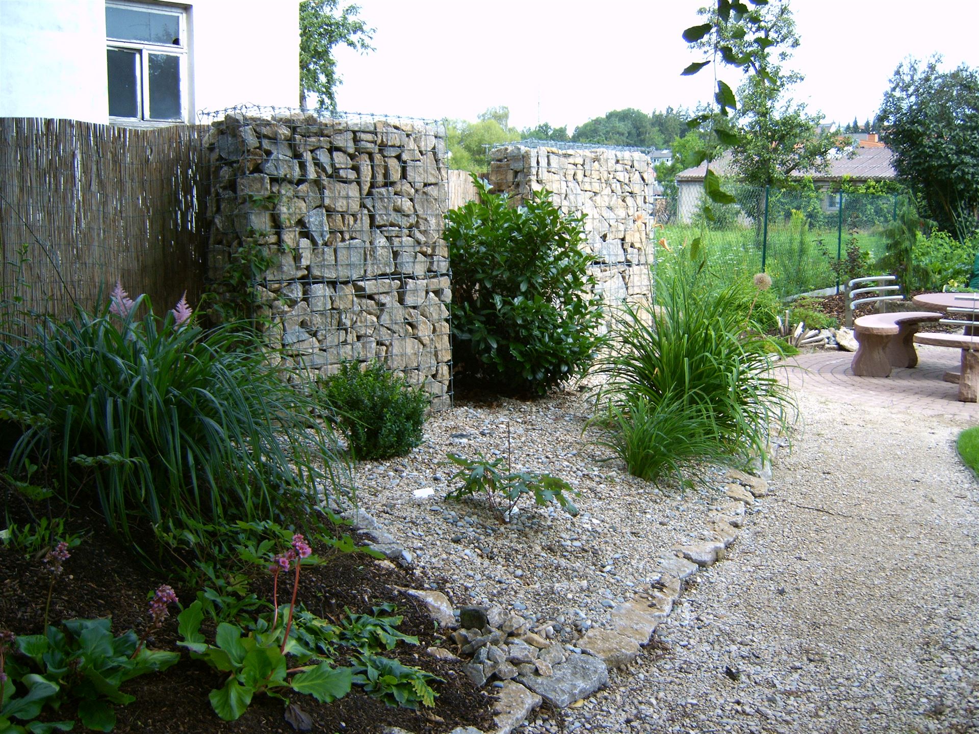 Materialien, die in den Trockenmauern und in den Gabionen verwendeten Feldsteine, geben diesem Garten einen natürlichen Charakter. Die Waldecke mit diversen Schattenstauden und Farnen schließt an üppige Staudenbeete an. Gerade bei Nacht - in angestrahltem Zustand- sind die Gabionenkörbe mit den vorgepflanzten Gräsern ein echter Hingucker.