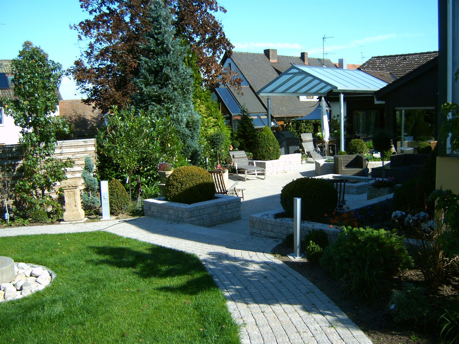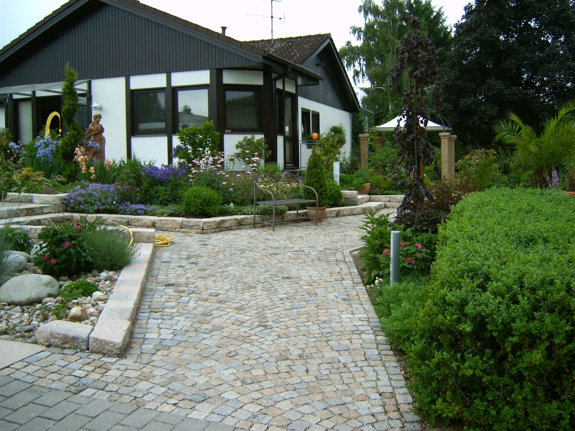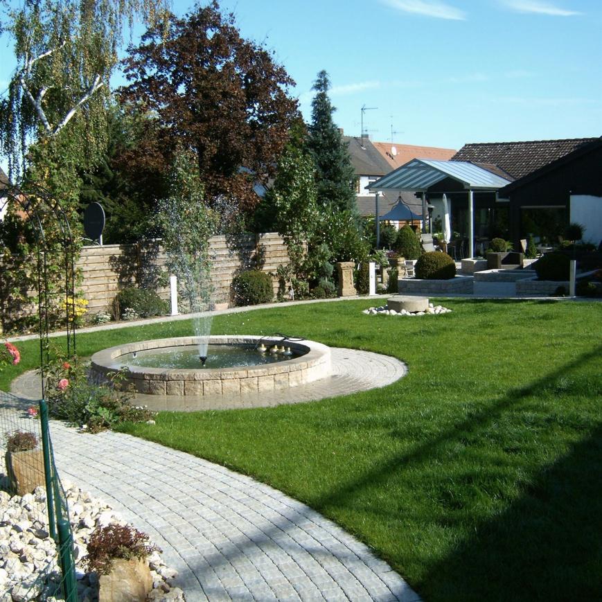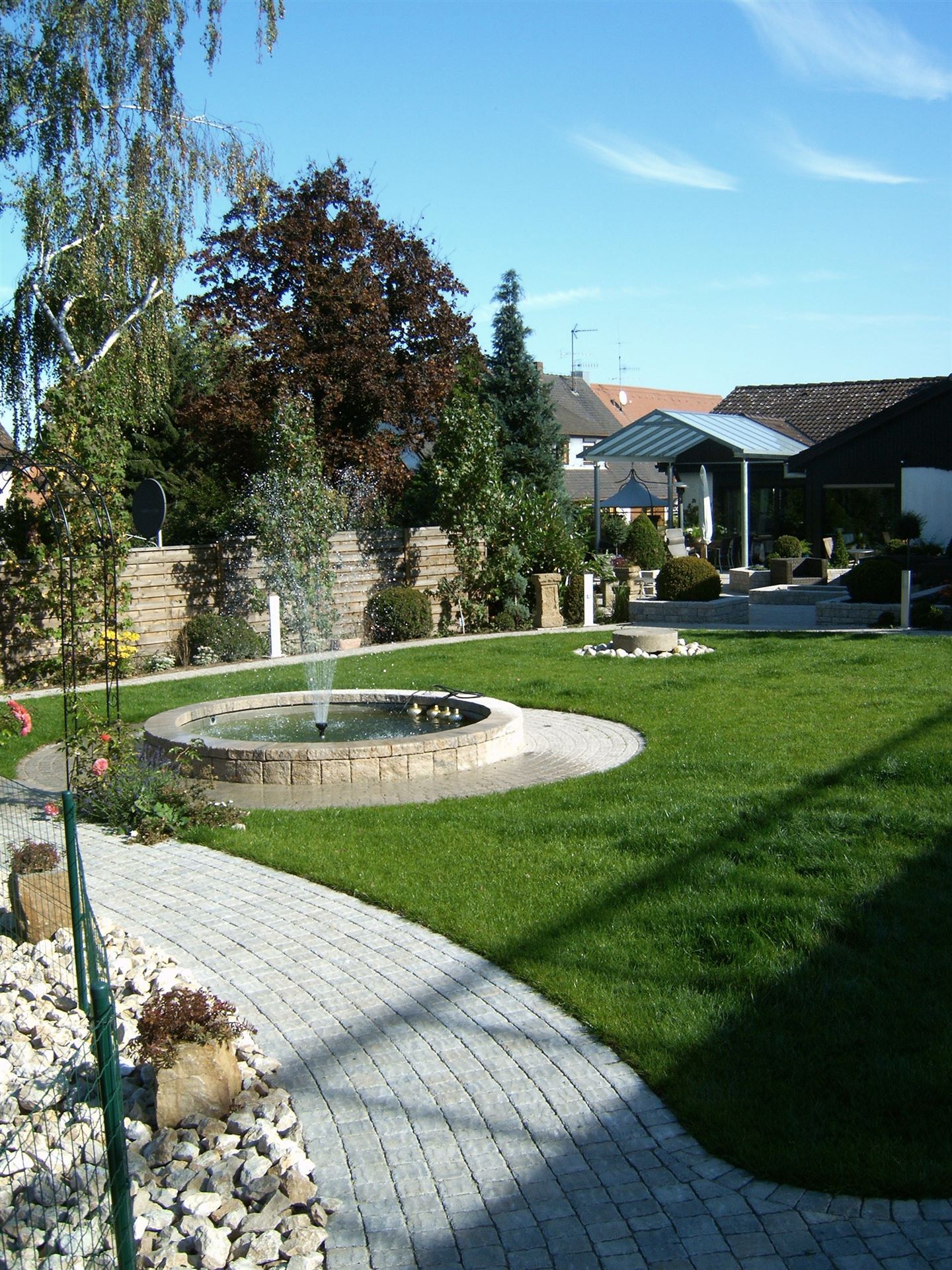 Parkähnliche Rundwege, eine imposante Teichanlage, ein großzügiger Loungebereich und ein Fontainenbrunnen als optisches Highlight, machen diesen Garten zu einem echten Schmuckstück